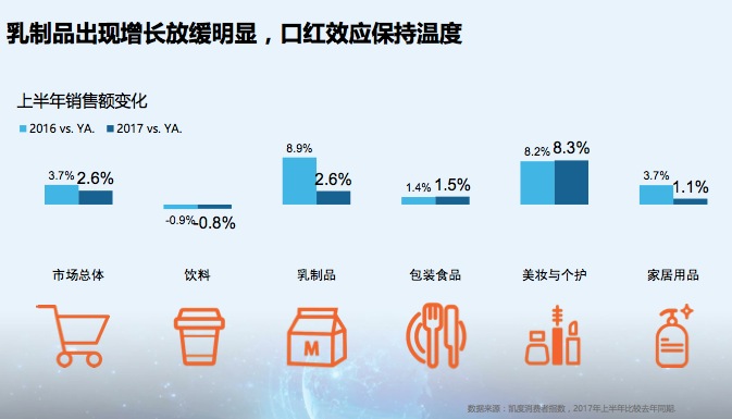 报告显示,2017年上半年,中国快消品市场温和增长2.6%,较2016年增速有所下降,总体表现趋紧,例如乳制品销售额增速放缓趋势明显,增幅从去年的8.9%下滑至今年的2.6%,不过个人护理品牌反而能继续保持较高的增速,销售额增速为8.3%,凸显口红效应。