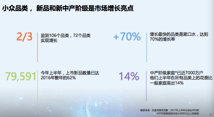 凯度消费者指数中国区总经理虞坚指出,中产阶级消费能力很强,是快消品、新品、小众品类的支持者,例如小众品类的漱口水增速70%,很大部分就是这一部分人群的贡献所致。另一个品类——气泡水与高端饮用水也已经成为中产生活方式的标志,据CTR的数据,这两类水产品上半年销售获得了29%的增速。