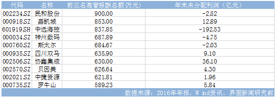 这其中,2016年民和股份(002234.SZ)、嘉凯城(000918.SZ)、中远海控(601919.SH)三家公司的前三名高管年薪分别为900万元、853万元、837.85万元,远远高于其行业平均水平。申万一级行业数据显示,当年这三家公司所在行业的前三名高管薪酬的平均值分别为189.86万元、405.66万元、220.21万元。