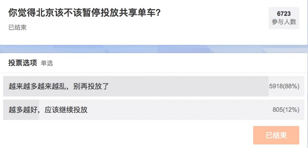 一线城市中,目前也只有北京还没有叫停共享单车的投放,而微博大 V @北京人不知道的北京事儿不久前曾在微博发起一项「北京该不该暂停投放共享单车」的投票,近 9 成网友认为应该暂停投放。尽管投票的样本有限,但共享单车乱停放以及分布不均衡等问题确实存在。