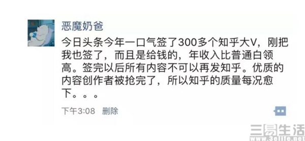 事情要从知乎大V恶魔奶爸的微信截图开始说起,几天之前这张微信朋友圈截图引爆了微博,原来最近今日头条一口气签下了300多个大V入驻,并且给出了白领级别的签约费。据说这个签约费在20万左右,这个数字确实是有根据的,因为去年就曾经曝出过今日头条挖知乎大V的聊天截图,图中显示作者一个月回答15个问题有1万元的报酬。