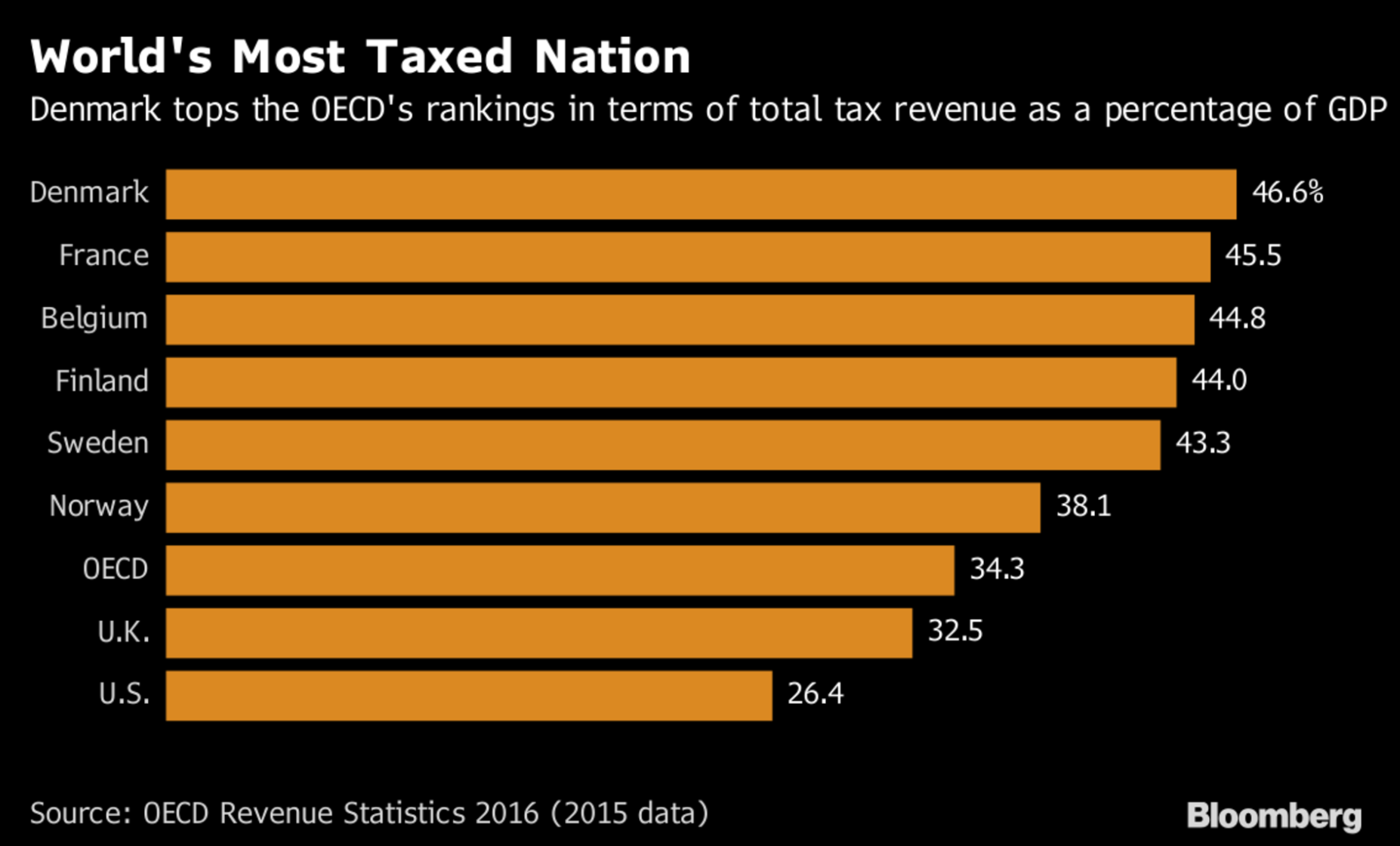 经济合作与发展组织(OECD)的数据显示,丹麦的税收与GDP总额之比高达46.6%,是发达国家中最高的。2016年,丹麦劳工的平均净税率为36%,远高于经合组织成员国25.5%的平均值。