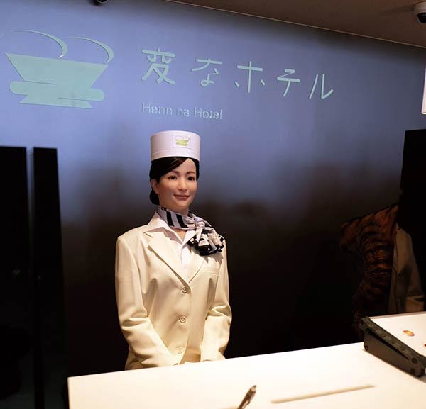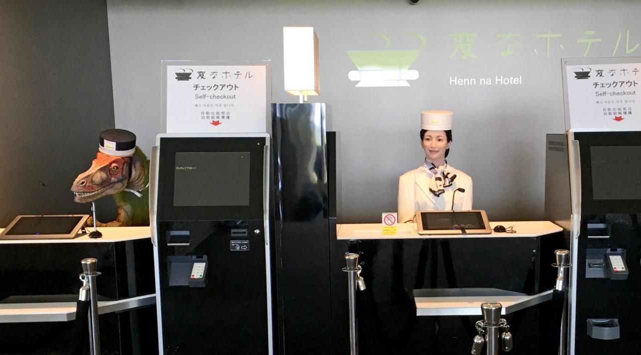 比如这家位于日本長崎县佐世保市的“怪奇旅馆”(変なホテル)。进门大多会被前台的恐龙状机器人吓一跳,而当你以为中间唯一的人类会微笑欢迎你时——走近一看,只是个人形机器人,笑容还带点儿诡异。