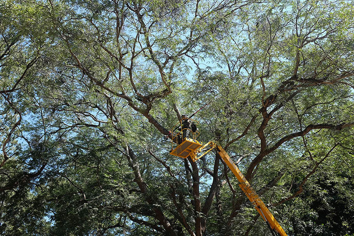 22. Mana Pools里的树动辄二三十米高。为了清理Mana Pools里的寄生斛,志愿者们必须站在升降机上作业。