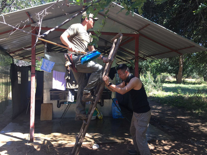 10. 建设营地时,志愿者们为了打扫房顶上太阳能热水器,只能当人肉梯子。