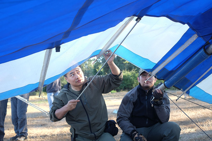 14. 每次来Mana Pools志愿者们都要细心维护飞行器,保证巡逻时的飞行安全。志愿者们在装配动力三角翼,为接下来的飞行巡逻做准备。