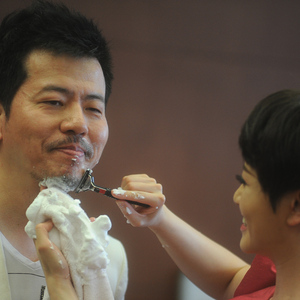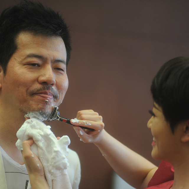 题图:2013年08月,南京,十五年从未剃光过胡子的黄国伦,在主持人妻子寇乃馨的见证下,为了南京亚青会剃光了所有的胡须。用他的话说:“自从谱写了亚青主题曲《让梦想起飞》、《我们的青春》以后,我就想从内到外年轻一次。”