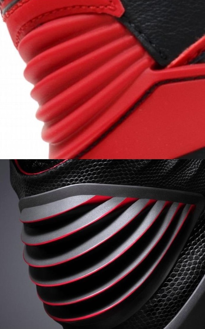 7. 鞋身后跟部位采用较为传统的模塑皮革、翻毛皮与电子编织工艺搭配,延续了Air Jordan 2 的运动奢华风,使鞋身更加平衡。有棱纹的鞋后跟支撑架受到乔丹本人的启发,六条纹路象征着乔丹的六座NBA总冠军奖杯。比起Air Jordan 2,后跟支撑架更加棱角分明,触感更加特别。