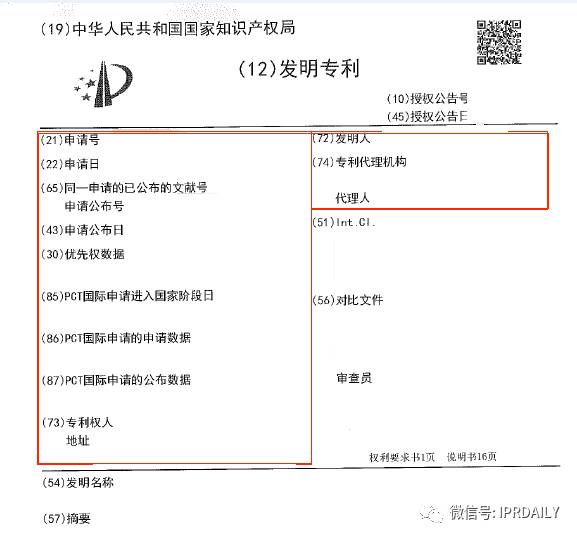 一句话来记忆就是:我们看到的公布文本/授权文本中除技术内容、官方公布的信息之外的内容就是著录项目信息。(如下图红框部分)