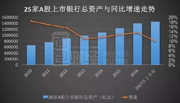 今年上半年,在A股上市的25家银行总资产突破145万亿,但资产增速却仅为4%,这一增速与去年同期相比大幅下滑。在金融去杠杆、银行监管加强的背景下,银行资产规模扩张的脚步可能会越来越慢。
