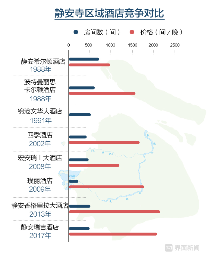 以静安寺为核心,在步行十分钟内的距离内,聚集了五家五星级酒店,其中既有波特曼丽思卡尔顿这样同样老牌的酒店,也包括宏安瑞士(2008)、璞丽(2009)、静安香格里拉(2013)在内的新兴“劲敌”。