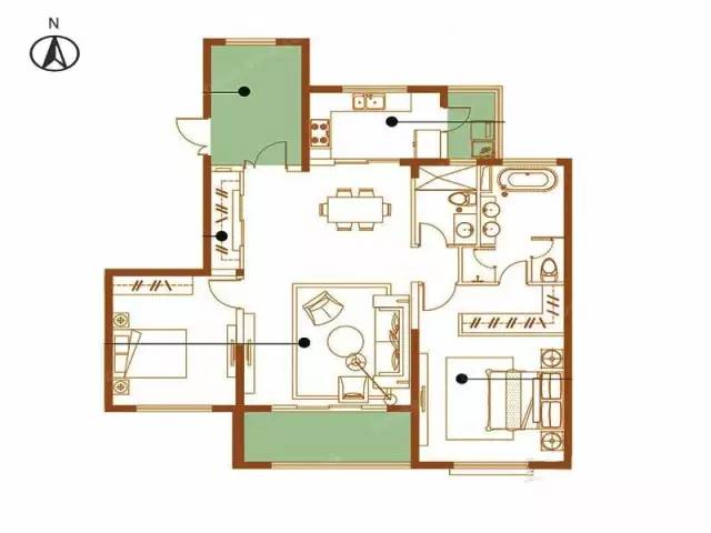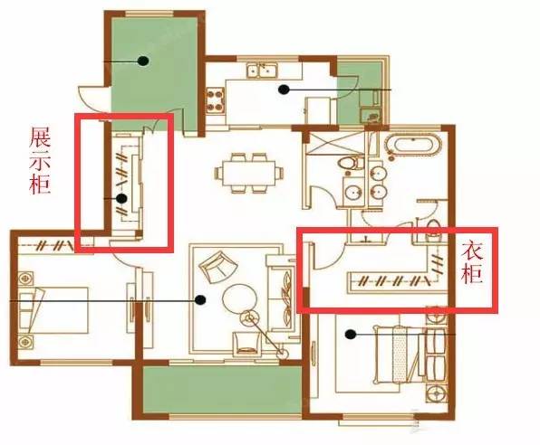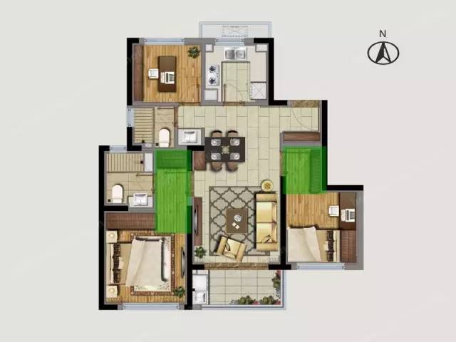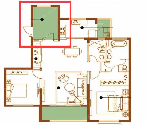 某楼盘的89平户型,面积不够大,做了3室2厅2卫,户型却不够紧凑,拐角多,标绿的面积都浪费了。