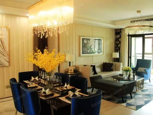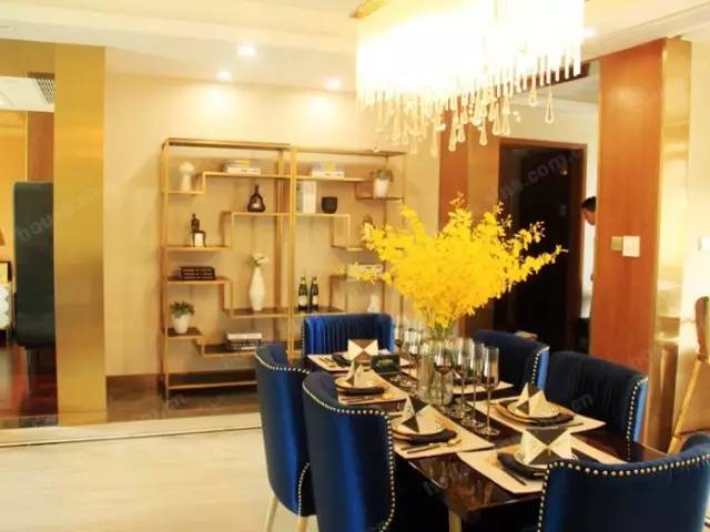 卧室大了,客厅和餐厅就相对小了,餐厅对面放的是一个展示架,真正入住的时候装修成组合柜会更实用。