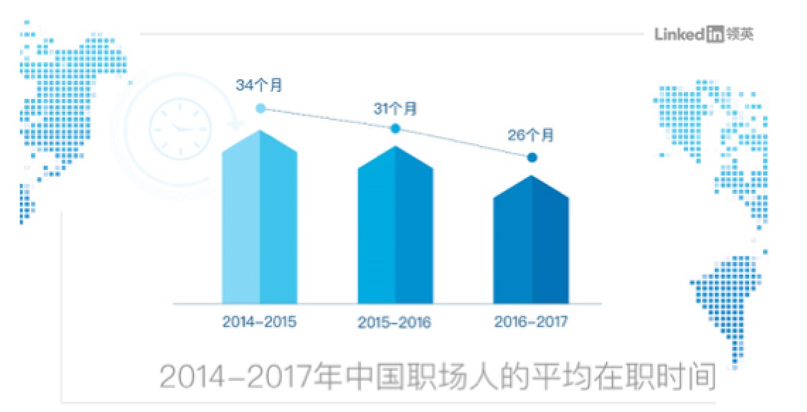 领英平台大数据分析显示:2016-2017年,中国职场人的平均在职时间为26个月,这意味着职场人平均两年多就会选择跳槽。而2014-2015年这个数字为34个月。与此同时,领英调研发现,超6成的中国职场人表示很愿意了解新的职业机会。领英中国董事总经理于志伟表示:“造成我国人才流动加快的动因来源于经济环境的变化以及新兴的职业价值观,一方面,中国经济全球化与科技创新不断提速,打破了行业和地域界限,为人才提供了更多的就业选择;另一方面,我国职场人呈现‘开放’、‘跨界’和‘目标驱动’这三大核心特征,这样的职业价值观趋势职场人不断追求更好的职业发展机会,然而也为企业雇主留住优秀人才带来了更大的挑战。”
