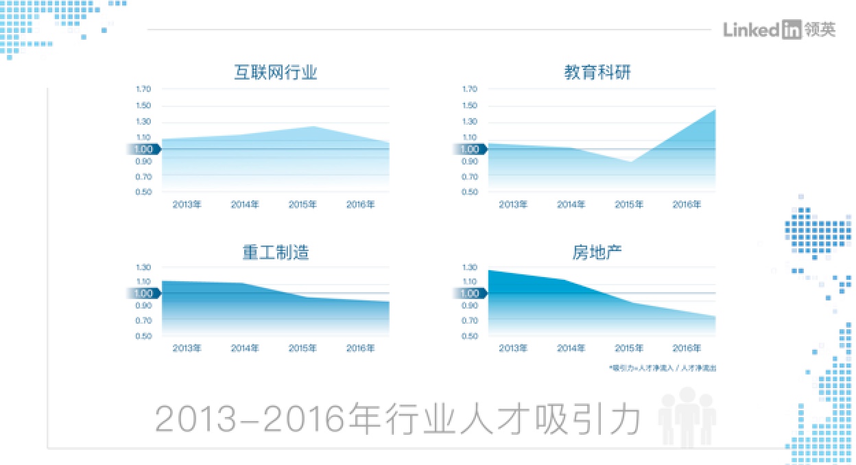 领英增长与国际业务数据科学负责人周洋表示:“人才的‘跨界’流动是当前中国产业转型升级驱动下的一个显著趋势,反过来也折射出了产业转型的特征和进程。比如在过去一年,我们看到互联网行业的人才流入/流出量是所有行业中最高的,互联网在与传统行业融合的过程中也催生了更多新的职位需求。然而,不能忽略的是随着互联网创业与投资回归理性,一些互联网创业公司进入资本寒冬,使得互联网行业人才吸引力也较去年同期有所下降。而一些缺乏颠覆性技术革新的传统行业却面临较为明显的人才流失,比如重工制造和房地产业,前者需要紧握智能制造战略机遇,加大投入吸引资深技术和管理类人才,而后者在与互联网模式融合的过程中产生了一些泡沫和非理性投资,需打造可持续的商业模式吸引和留住人才。”