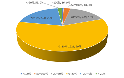 9月5日,上证指数收于3384.32点,创下阶段新高。界面新闻整理了5月24日(沪指3064.08点)至今A股市场个股的涨跌情况(剔除2015年7月1日以后上市以及目前处于停牌状态个股)。数据显示,多数个股股价随大盘出现不同程度上涨。在纳入统计范围内的2762只个股中,2157只区间涨幅为正,占比78.09%,其中16只个股股价实现翻倍式增长。同时,也有55只个股下跌超过了20%,15只个股区间跌幅逾三成。