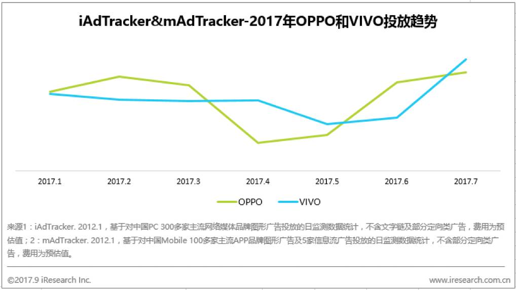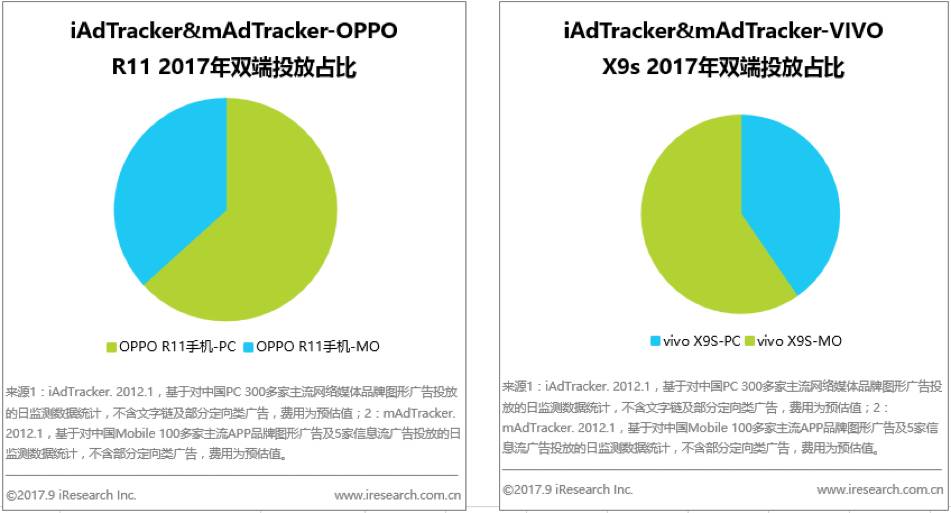 艾瑞数据显示,在2017年上半年,OPPO和VIVO在投放端口的选择上基本相同,PC端和移动端都占到了整体投放份额的一半左右。但针对新产品的宣传,两家有着截然不同的选择。
