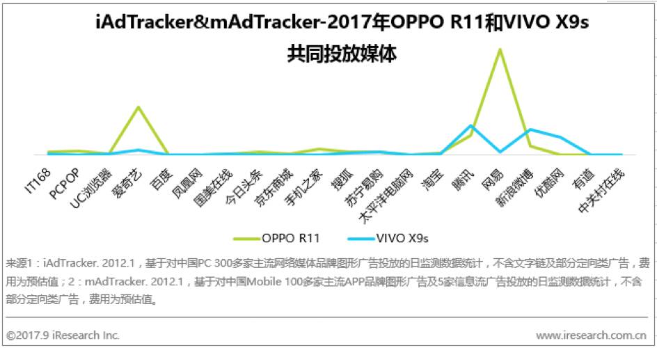 在共同投放的媒体中,OPPO R11更加倾向于网易、爱奇艺、手机之家等媒体,而在VIVO X9s的投放中,优酷、新浪微博、腾讯等媒体则占据了大部分份额。