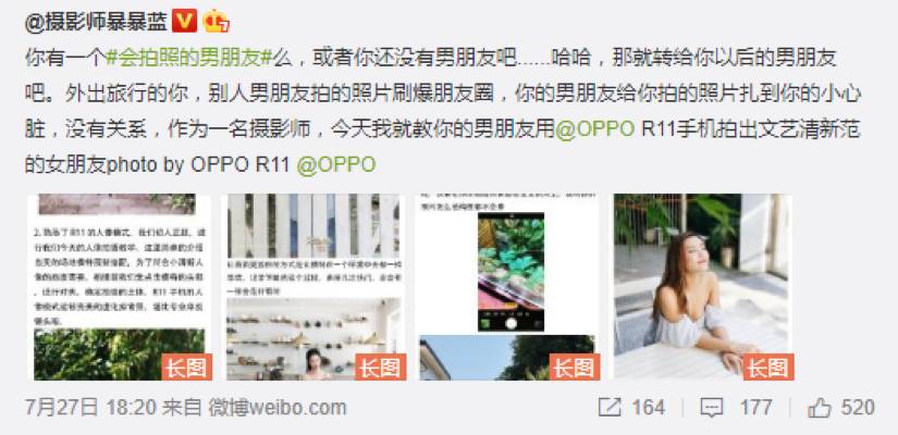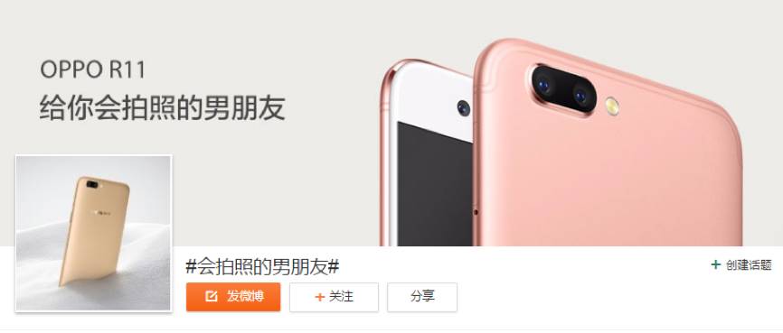 在拍摄功能上,R11主推 “会拍照的男朋友”的概念。关于男朋友的拍照技术,曾一度成为了网络上的热议话题,这个理念也引起了网友的共鸣。所以除了明星代言,在微博中还有很多网红、摄影师发布了R11的拍照功课,进行技术宣传。