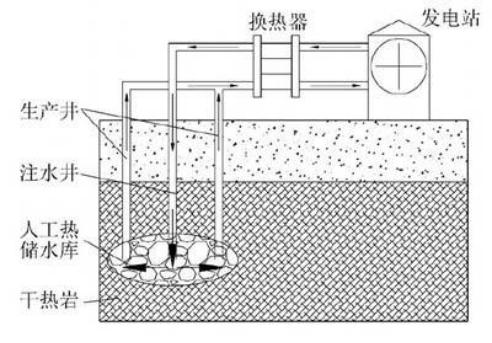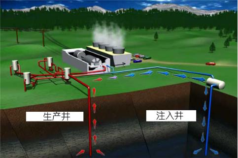 再通过另一个专用深井(相距约200~600米左右)将岩石裂隙中的高温水、汽提取到地面;