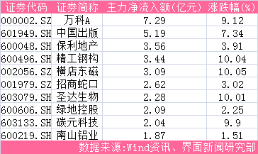 今日房地产板块集体走强。万科A(000002.SZ)、保利地产(600048.SH)、招商蛇口(001979.SZ)、绿地控股(600606.SH)等四只地产股成为主力资金激烈争抢的对象,其主力净流入额分别为7.29亿元、3.56亿元、2.62亿元、2.09亿元。此外,中国出版(601949.SH)、精工钢构(600496.SH)、圣达生物(603079.SH)等次新股再度获主力资金力捧,分别净流入5.19亿元、3.44亿元、2.28亿元。其中,精工钢构、圣达生物均以涨停报收。