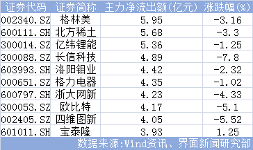 周期股午后走弱,盘中多只周期热门股遭遇主力抛售。格林美(002340.SZ)、北方稀土(600111.SH)、洛阳钼业(603993.SH)均遭遇主力净流出,其净流出额分别为5.95亿元、5.68亿元、4.42亿元。此前大热的“锂电池人气股”亿纬锂能(300014.SZ)今日遇冷,净流出5.36亿元。石墨烯概念股出现分化,碳源科技(603133.SH)获主力2.04亿元抢筹,而宝泰隆(601011.SH)却遭主力抛售,净流出3.93亿元。此外,三只“人工智能概念股”浙大网新(600797.SH)、欧比特(300053.SZ)、四维图新(002405.SZ)亦被主力资金“抛弃”,分别净流出4.23亿元、4.17亿元、4.05亿元。
