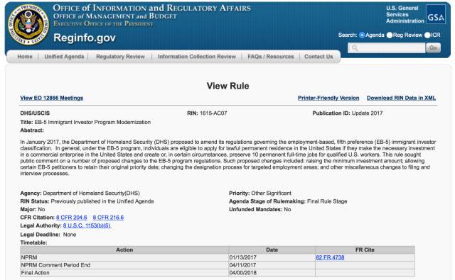 最新的消息是,在白宫下属的OIRA(信息与规章事务办公室),于上周发布的半年法规计划中,更新了移民局改革方案的时间表,将最终形成法规的时间敲定在了2018年4月。据此大胆预测,在930之前,应该还会提出EB-5改革的新法案,之后跟随国会临时预算案短暂延期。在这之后,再做定夺是否正式推出新法案。