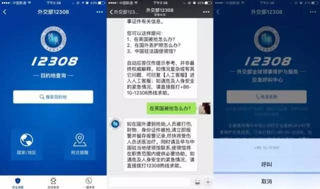 外交部22日举行发布会,正式推出12308微信版——全新升级的“领事直通车”微信公众号和全新推出的“外交部12308”小程序。今后,在海外的中国公民除了可以继续拨打“外交部全球领事保护与服务应急呼叫中心”12308热线外,还可通过微信平台实时咨询和求助,以方便在海外的中国公民根据自身情况选择最合理恰当的求助方式。