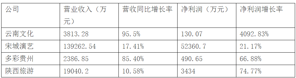 2017年上半年,由杨丽萍控股的云南文化一举实现了业绩暴增。与此同时,以《长恨歌》为代表的陕西旅游、以《多彩贵州风》为代表的多彩贵州,以及操盘“千古情”系列的宋城演艺,无论是营业收入还是净利润,同期都出现了双位数的增长。