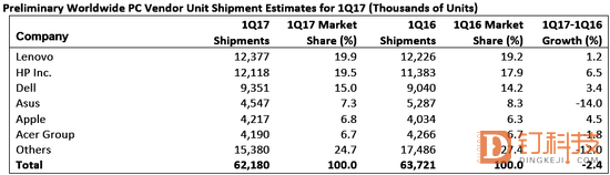 Gartner报告显示,2017年第二季度PC市场出货量整体依旧呈现下滑趋势,同比下降4.3%至6110万台,创下自2007年以来的十年最低纪录。除惠普与戴尔出货量微增以外,其余品牌均有不同程度的下降,华硕和宏碁出货量同比降幅则达到双位数。