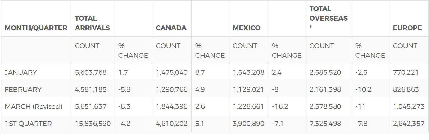 根据美国商务部的数据显示,2017年3月,美国的海外游客总数比2016年同时期下降了7.8%。将墨西哥、加拿大囊括在内计算,国际游客总数则下降了4.2%。以下是商务部提供的最新数据。
