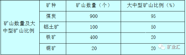 到2020 年,全省煤炭矿井个数控制在900 个以内,通过联营、兼并等措施,关小建大,减少矿山数,扩大单个矿山开采规模。铝土矿山到2020 年控制在100 个以内,大中型矿山的比例提高到50%;铁矿山到2020 年控制在400 个以内,大中型矿山比例数提高到20%;铜矿山到2020 年达到20 个,大中型矿山比例提高到20%; 其他矿山大中型矿山比例均有所提高。