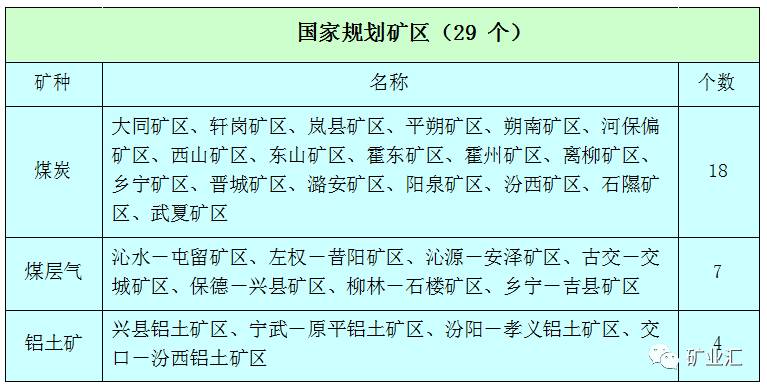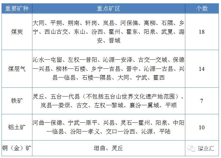 规划期间,全省共划定重点矿区51 个,其中煤炭18 个、煤层气14 个、铝土矿10 个、铁矿7 个、铜(金)矿2 个。