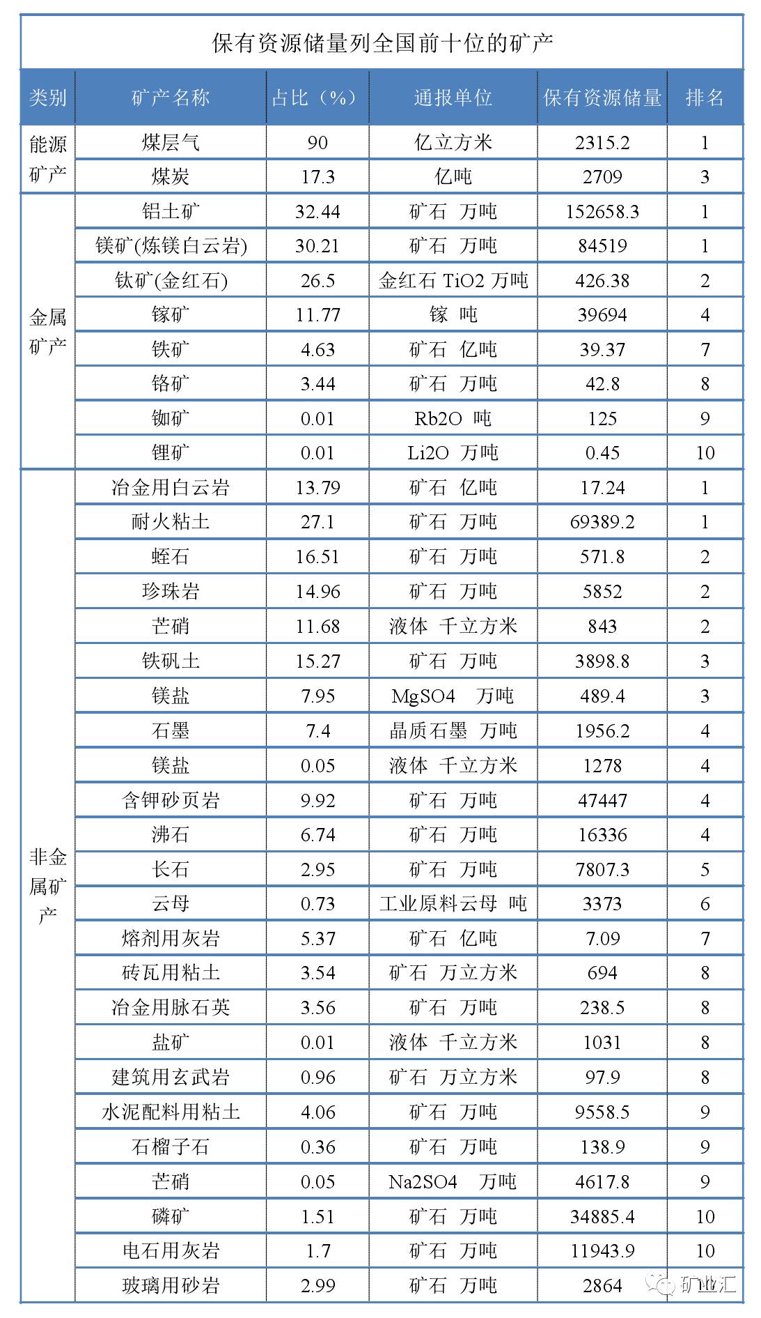 截至2015 年底,山西共发现118 种矿产(以亚种计),有查明资源储量的矿产61 种,其中34种矿产保有储量位列全国前十名,作为煤炭大省,山西煤炭保有储量排名第三;煤层气、铝土矿、镁矿、冶金用白云岩、耐火粘土五种矿产保有储量位列全国第一。