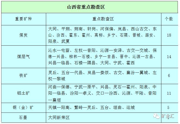 全省共划分出重点勘查区55个,其中煤炭18个、煤层气14个、铁矿6个、铝土矿11个、铜(金)矿5个、石墨1个。