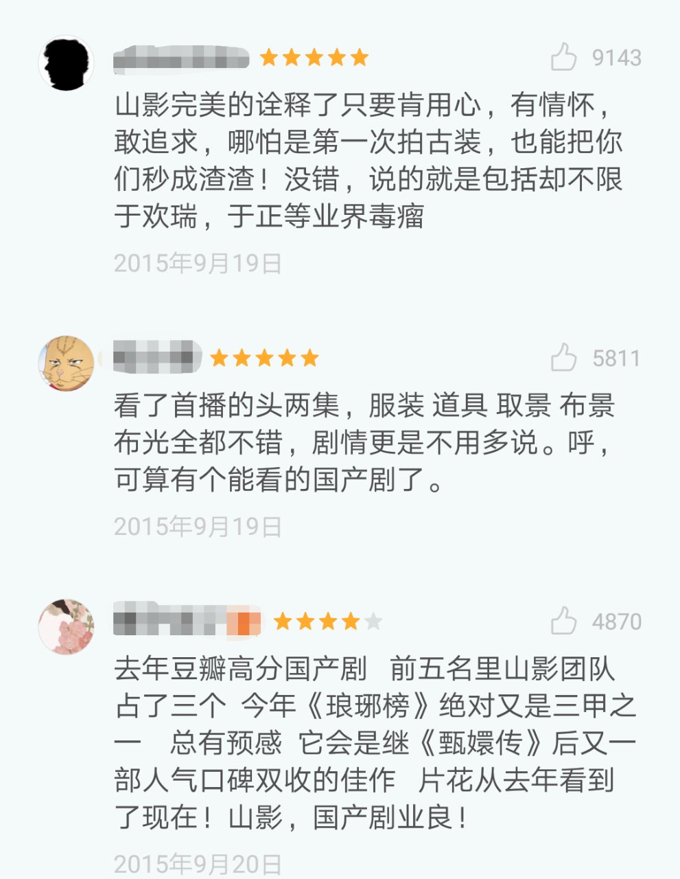 层出不穷的女主戏引发新思考,只有女主戏才能获得高收视和高流量吗?答案似乎并不是。以2015年的《琅琊榜》为例,获奖无数并且出口国外,得到了众多好评,豆瓣上近20万观众打出了9.1的分数,男主戏的影响力也可以完全不输《后宫甄嬛传》。