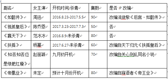 一方面是口碑的下滑,而另一方面则是居高不下的关注度,为了迎合电视剧市场的选择,一大批新的“大女主戏”又被提上日程,流量小花纷纷挑起大梁出演女主戏,各种“天下”、“皇后”剧名让人看花了眼。