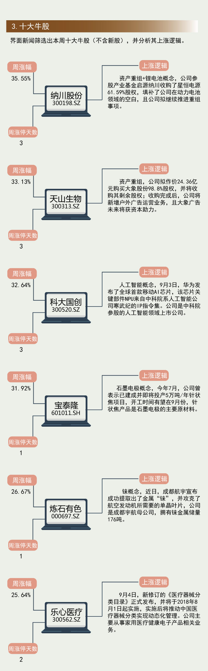 界面新闻筛选出本周十大牛股,并分析其上涨逻辑。