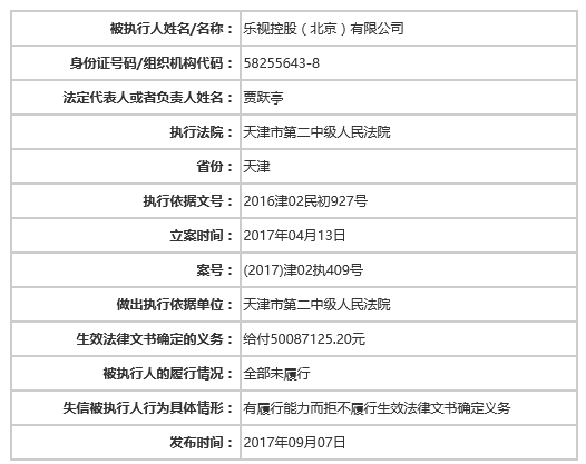 9月7日,根据最高人民法院中国执行信息网公布的信息,乐视控股(北京)有限公司和乐视移动智能信息技术(北京)有限公司被列入了全国的失信执行人名单。其中,公司法人代表分别为贾跃亭和贾跃民,两家公司涉及失信金额总共超过1亿元。