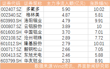 锂电池板块今日再度全线爆发。多氟多(002407.SZ)、格林美(002340.SZ)、沧州明珠(002108.SZ)等个股获主力青睐,主力净流入额分别为5.90亿元、4.87亿元、2.89亿元。其中多氟多午后实现封涨停。此外,有色板块亦延续了此前的强势表现。洛阳钼业(603993.SH)、云铝股份(000807.SZ)、中国铝业(601600.SH)、华友钴业(603799.SH)等个股纷获主力热捧,分别实现净流入4.79亿元、3.89亿元、3.70亿元、2.33亿元。而受有机硅价格上涨影响,单晶硅龙头企业隆基股份(601012.SH)获主力净流入2.79亿元,并以涨停报收。