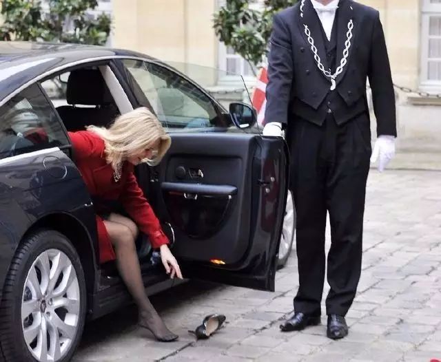 丹麦首相托宁施密特准备下车时高跟鞋掉了,她无奈地坐在车里弯腰伸手去捡鞋