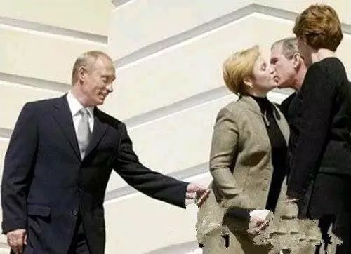 布什亲吻普京夫人,普京则在一旁静静的看着