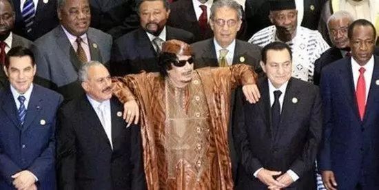 2010年10月10日,利比亚领导人卡扎菲合影时双手搭在埃及总统(右)和也门总统(左)的肩上,这姿势真是霸气十足
