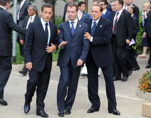 2009年7月8日,意大利拉奎拉,参加G8峰会的俄罗斯总统梅德韦杰夫走起路来身子有些倾斜似乎是喝醉了酒的样子,意大利总理贝卢斯科尼(右)小心搀扶着他,生怕一松手,梅德韦杰夫就会摔倒,法国总统萨科齐(左)也在旁边护卫。
