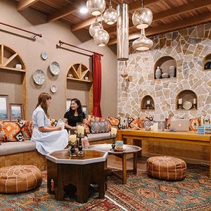 令人意外的亮点出现在会议室。猫途鹰在北京的办公室共有约100人左右,却有着六间风格迥异的会议室,分别以燕京、暹罗、马尔代夫、古里、蒙巴萨和麦加等不同的城市为主题进行设计,每间会议室都以当地巨幅风景照作为几乎铺满整面墙的墙纸装饰,并从各种陈设细节里,凸显鲜明的异域特色,例如麦加会议室在墙壁上植入清真寺轮廓造型的LED墙灯,古里会议室内色彩艳丽的沙发、坐垫和黄澄澄的印度吊灯,马尔代夫会议室特别配置了海岛风浓厚的草编吊椅和懒人藤椅,燕京会议室内夺目的中国红色调等。