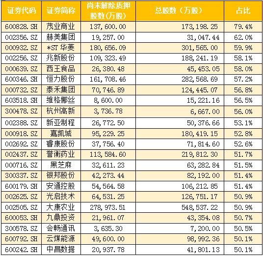 但是那22只质押比例超过50%的个股则需要留意风险了。整体质押率最高的是茂业商业,数据显示2016年以来,茂业商业的实际控制人深圳茂业商贸有限公司共计质押股份10次,其中尚有5笔共计13.76亿股被分别质押给了广州证券和华鑫国际信托。其中质押至广州证券共计10.82亿元,占总股本比例达到了62%,远超新规50%的界限。但是茂业商业整体的业绩较为稳定,2017年中报显示,其总收入达到57亿元,同比增长53%,净利润3.79亿元,同比增长74%。根据公告显示,深圳茂业商贸有限公司将股票质押所融资金用于茂业商厦及其下属子公司日常经营周转,大部分质押要到2017年末以及2020年到期。