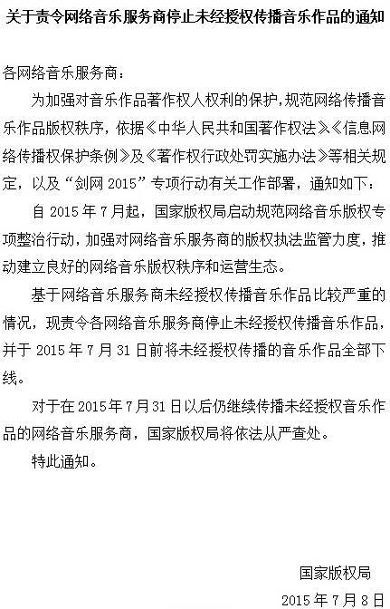 自2015年7月,国家版权局下发《关于责令网络音乐服务商停止未经授权传播音乐的通知》后,数字音乐市场便掀起来了一轮“版权大战”。