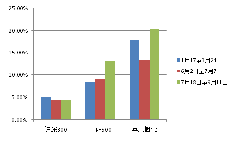 受此影响,整个资本市场对于苹果产业链相关公司今年的业绩预期十分乐观。同花顺数据显示,苹果概念指数今年共发生了明显的三波上涨,第一波为1月17日至3月24日,概念指数涨幅达到17.77%;第二波为6月2日至7月7日,概念指数涨幅达到13.30%;第三波为7月18日至9月11日,概念指数涨幅达到20.37%,相比于同期的沪深300以及中证500指数而言,均表现更加出色。