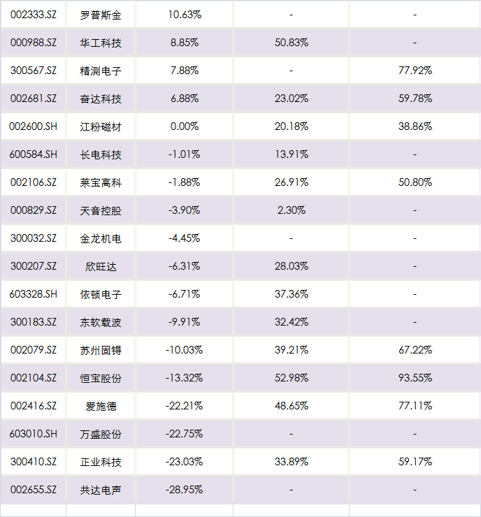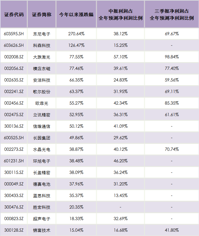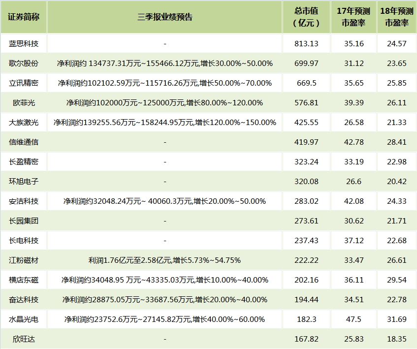 从此前中报公布的净利润占券商一致性预测全年净利润平均值的情况来看,超过50%的仅有3家,诚然行业特点决定了下半年才是全年业绩的“大头”,不过以三季报预告净利润的上限占全年净利润的比例来看,情况似乎不是特别好,36家公司中仅有17家公布了三季度业绩预告,而且公布业绩预告的公司中有10家比例未达到70%,在苹果新品制造发生问题的大背景下,全年能否如券商预测的“实现预期”仍然具有一定的不确定性。