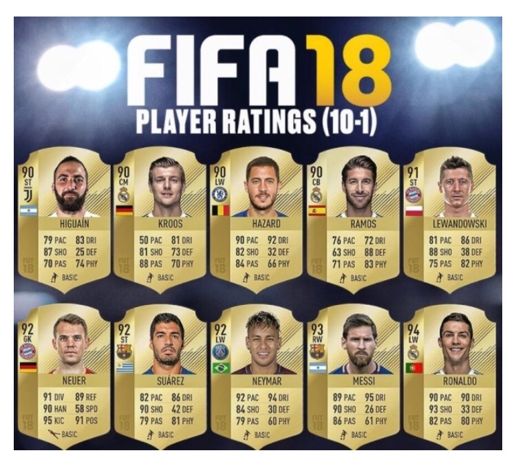 FIFA18能力值排名:C罗压梅西 诺伊尔进前10